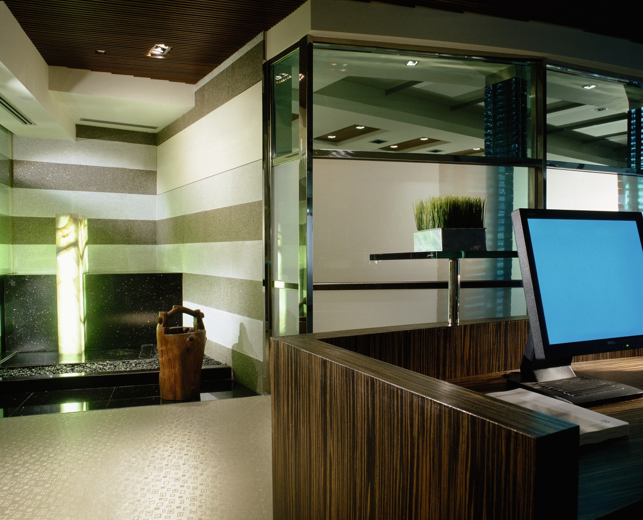 Another conversation starter is the water feature with its illuminated onyx column contrasting with shiny black pebbles and granite slabs.
