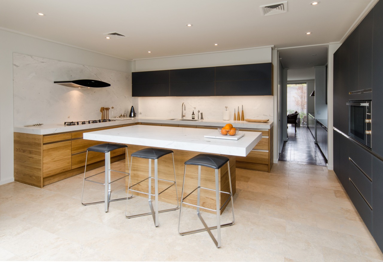 To avoid the rich timber over-powering the design, black matt glass-fronts were added on the upper perimeter cabinets along one wall at eye level and this surface is continued as a full wall of cabinetry on the adjacent wall. The upper cabinets are on electronic push-to-open mechanisms, while the balance of the cabinets have recessed metal pulls the minimalist hardware drawing the two cabinet styles together.